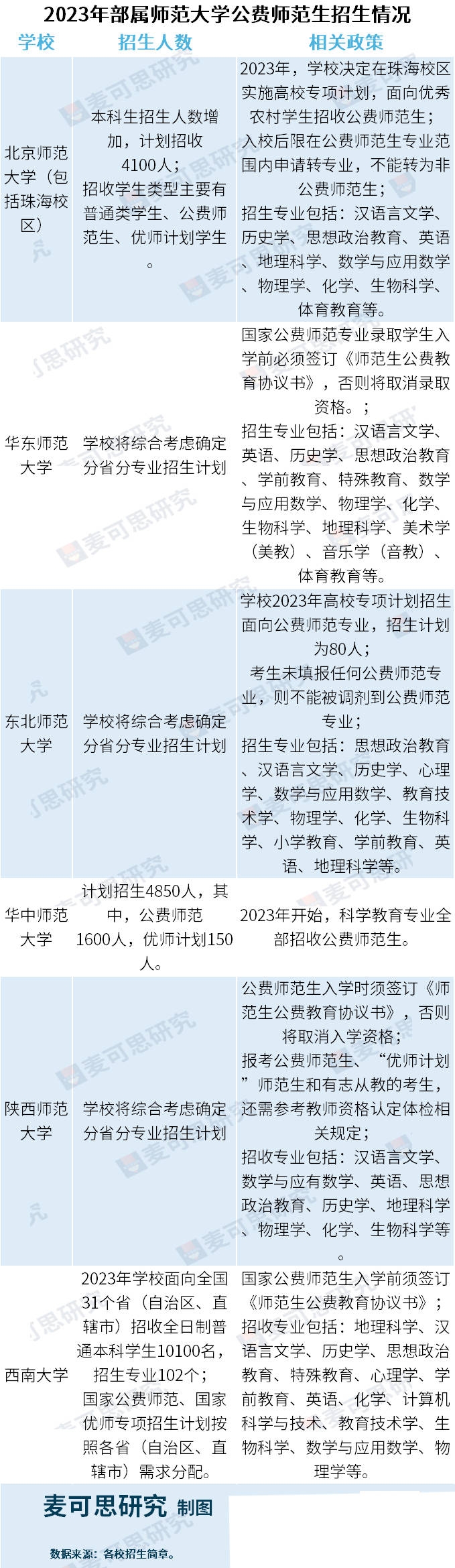 北京師范大學本科生在整體招生人數增加,并在珠海校區實施高校專項計劃,面向優秀農村學生招收公費師范生;華中師范大學計劃招收1600名公費師范生,比去年(1559人)略有增加,同時該??茖W教育專業從2023年起全部招收公費師范生。