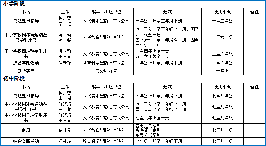 義務教育國家課程各學科使用《2023年義務教育國家課程教學用書目錄》中的教材。義務教育學校按規定開設地方課程,如需使用教材,必須在《北京市2023—2024學年度中小學地方課程教材目錄》中選用。學校開設的校本課程,原則上不編寫出版教材。