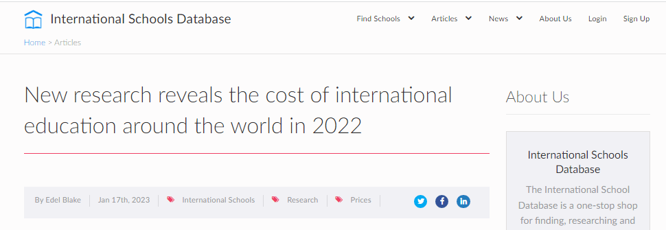 不久前,International Schools Database發布了2022世界國際教育消費排行榜。這是該平臺做這個統計項目的第四年。