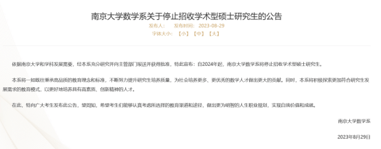 8月29日,南京大學數學系發布“關于停止招收學術性碩士研究生的公告”,自2024年起,南大數學系停止招收學術型碩士研究生。