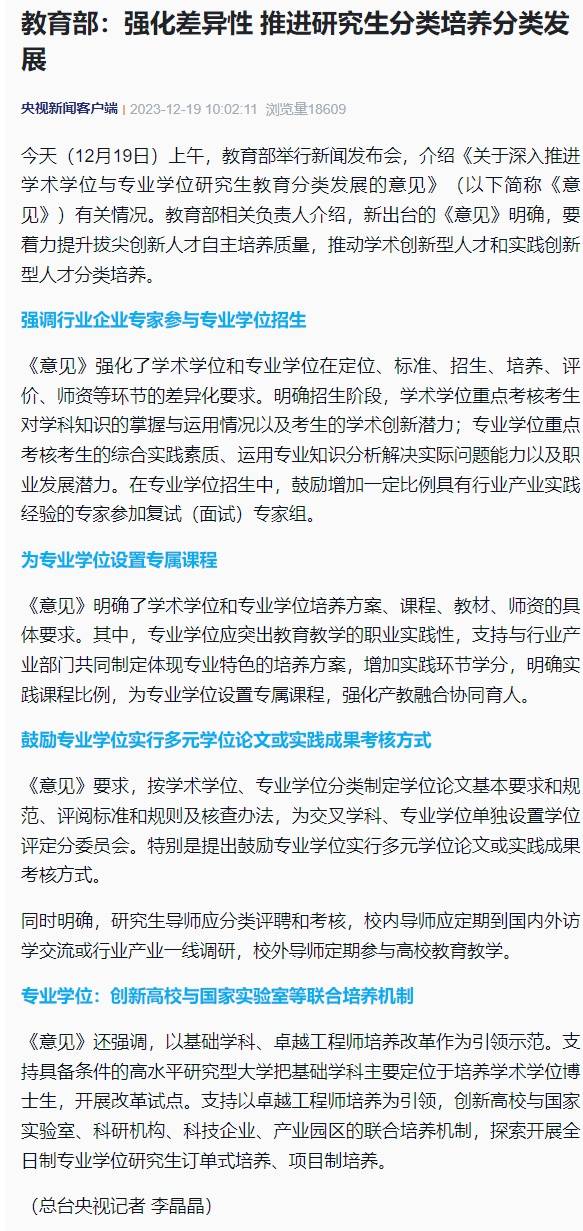 摘要: 原標題:教育部:強化差異性,推進研究生分類培養分類發展 今天(12月19日)上午,教育部舉行新聞發布會,介紹《關于深入推進學術學位與專業學位研