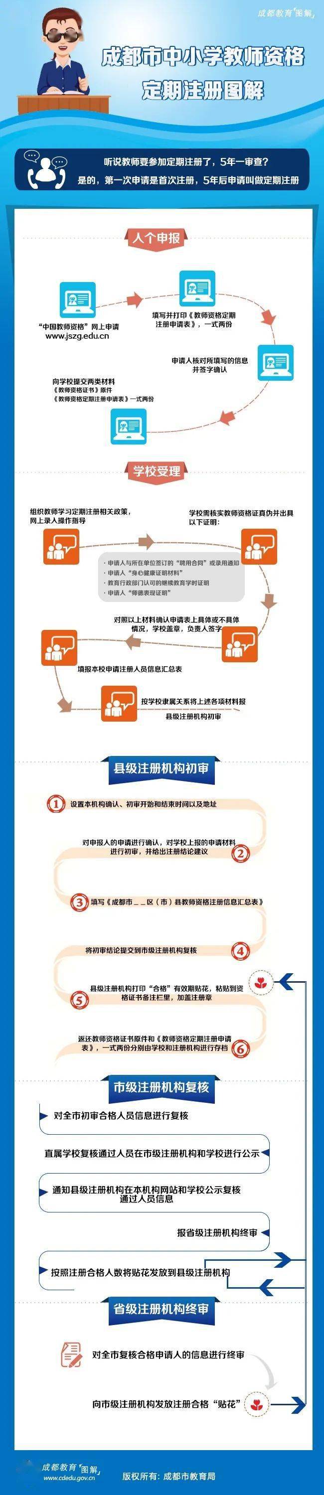 據四川省教育廳官網消息,從2015年起,成都全面實施教師定期注冊制度,對中小學教師資格實行5年一周期的定期審核。定期注冊不合格的人員,不得從事教育教學工作。