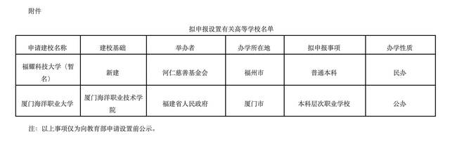 根據《中華人民共和國高等教育法》《普通高等學校設置暫行條例》《普通本科學校設置暫行規定》《本科層次職業學校設置標準(試行)》等有關規定,經福建省高等學校設置評議委員會專家考察和評議,現對擬向教育部申報設立福耀科技大學(暫名)等2個事項予以公示。