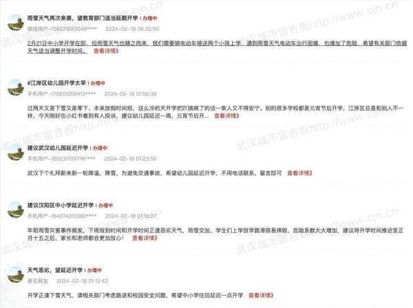 根據此前公布的武漢市2023—2024學年度中小學教學歷,武漢市小學和初中將在2024年2月21日正式開學。最近,有不少家長在武漢城市留言板留言稱,按天氣預報,2月20日至24日,武漢氣溫將極速下降,可能有凍雨和雨雪天氣,建議推遲學生開學報到時間,讓孩子們在家安安穩穩過完正月十五。