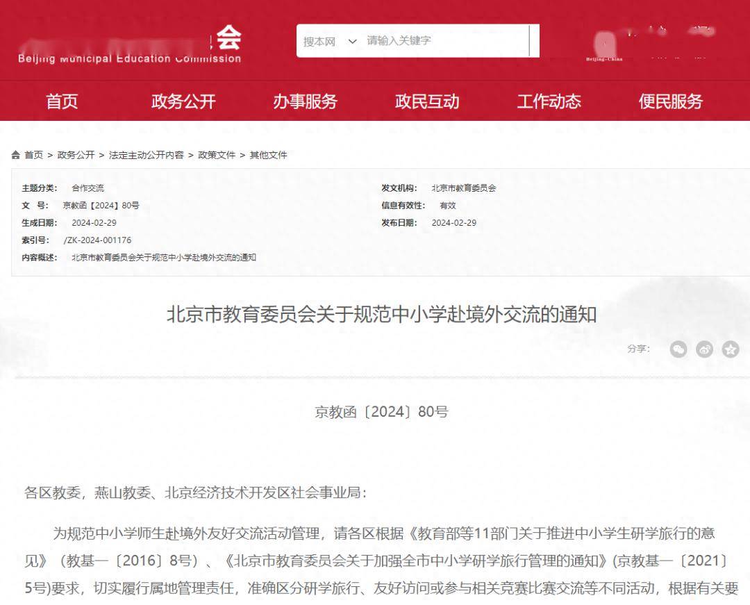 北京市教委近日發布通知,規范中小學師生赴境外友好交流活動管理。各區要嚴格審核把關,準確區分研學旅行、友好訪問或參與相關競賽比賽等不同活動,做好分類管理,確保師生安全。其中,學校組織研學旅行活動應堅持公益性、自愿參加原則。