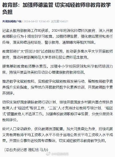 摘要: 原標題:需要減負的不只是學生!教育部:減輕教師非教育教學負擔 記者從教育部教師工作司獲悉,2024年將深化師德師風教育,深入開展教師職業行為十項準