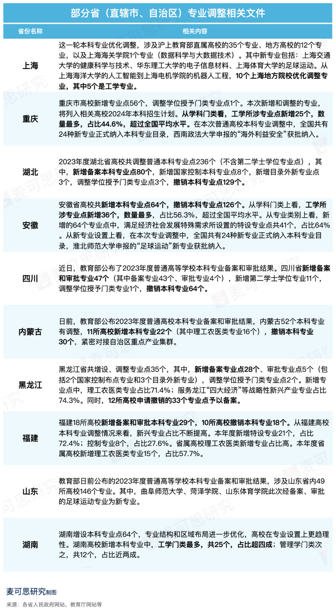 近期,隨著2023年度普通高等學校本科專業備案和審批結果的公布,一些省(直轄市、自治區)也陸續公布了2023年度專業調整的相關數據,其中,許多省份的高校都對本科專業進行了更進一步的調整。
