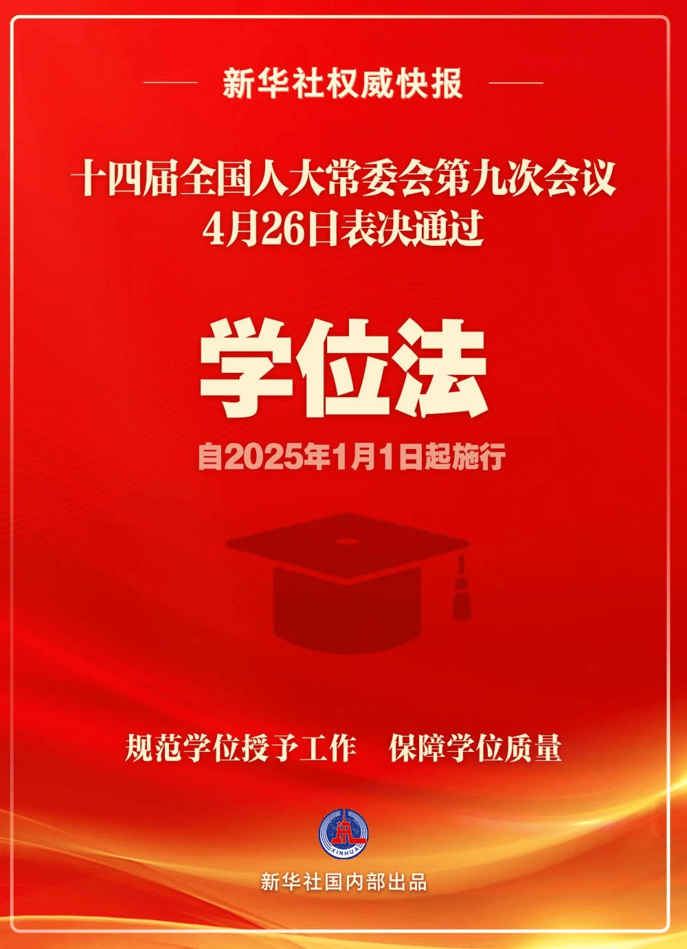 月26日,十四屆全國人大常委會第九次會議表決通過學位法,自2025年1月1日起施行。