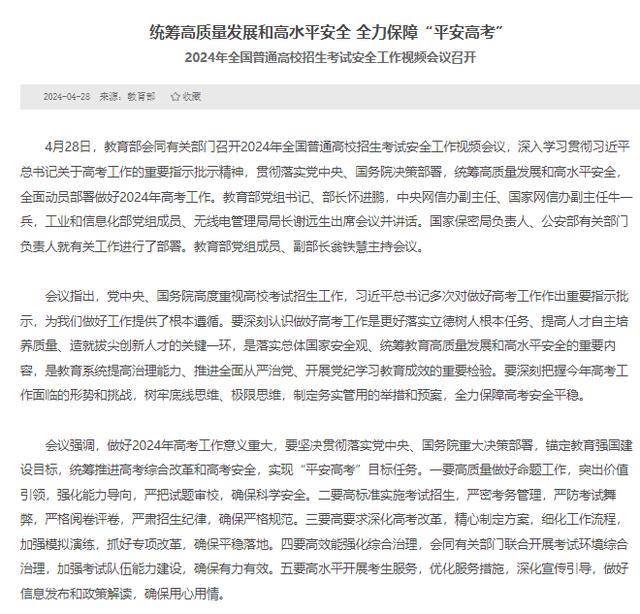 臨近高考,教育部及各省都陸續(xù)部署開展考試安全工作。據(jù)教育部官網(wǎng)消息,4月28日,教育部會同有關(guān)部門召開2024年全國普通高校招生考試安全工作視頻會議。