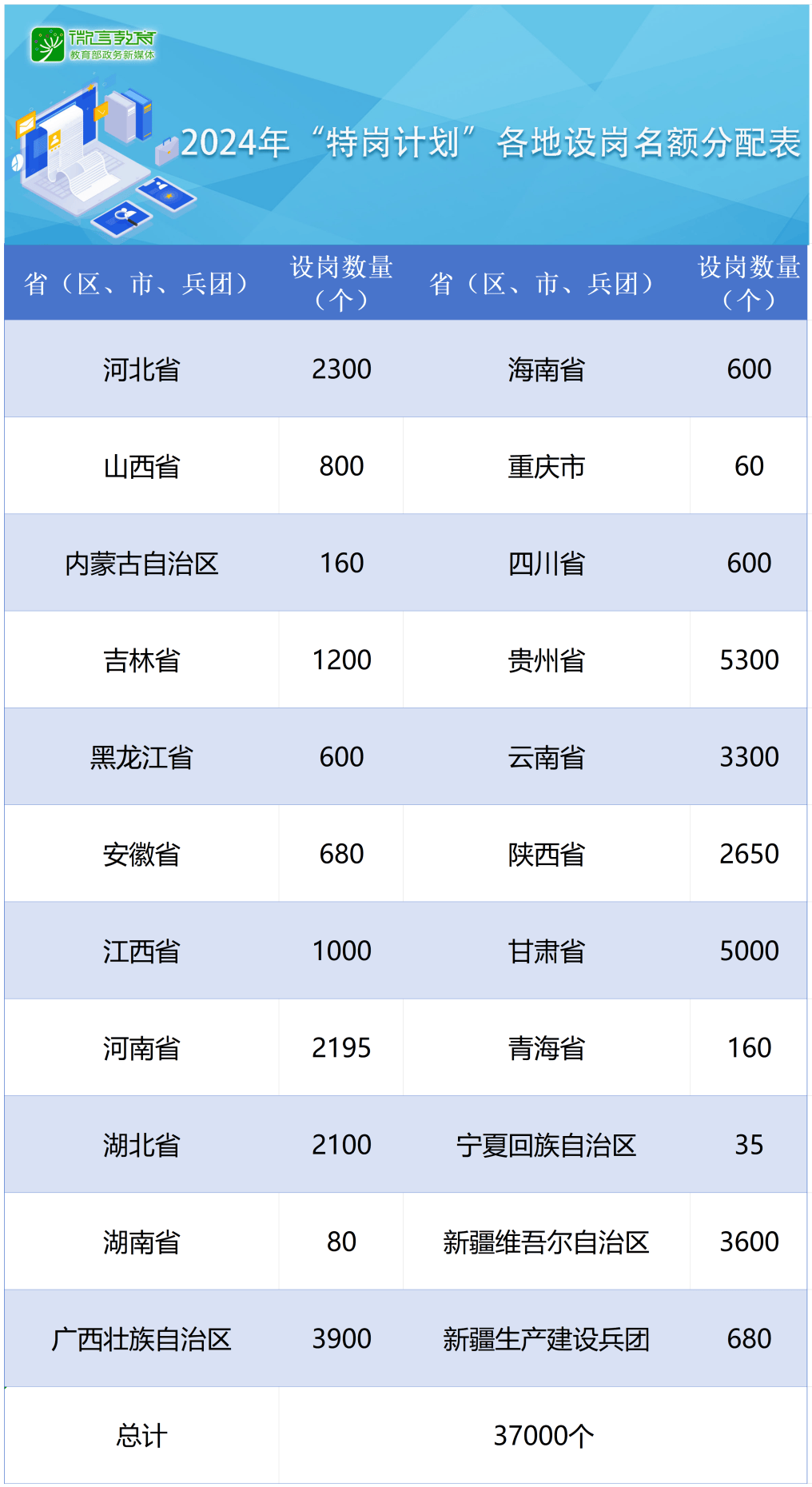 一起來看2024年“特崗計劃”各地設崗名額分配表↓↓↓