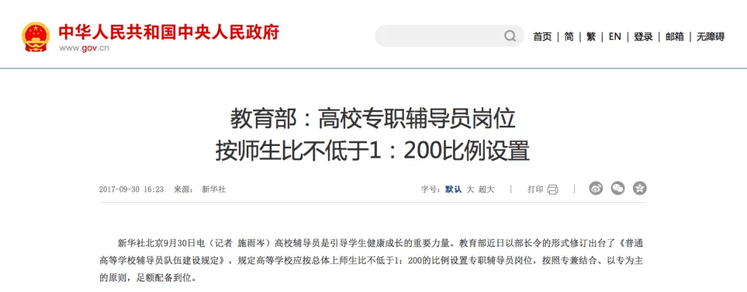 于是2017年,教育部在《普通高等學校輔導員隊伍建設規(guī)定》中對輔導員配置做出要求,“高校應按總體上師生比不低于1:200的比例設置專職輔導員崗位,按照專兼結合、以專為主的原則,足額配備到位。”
