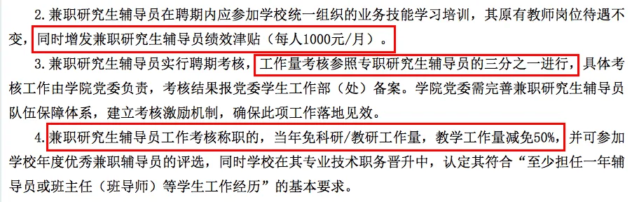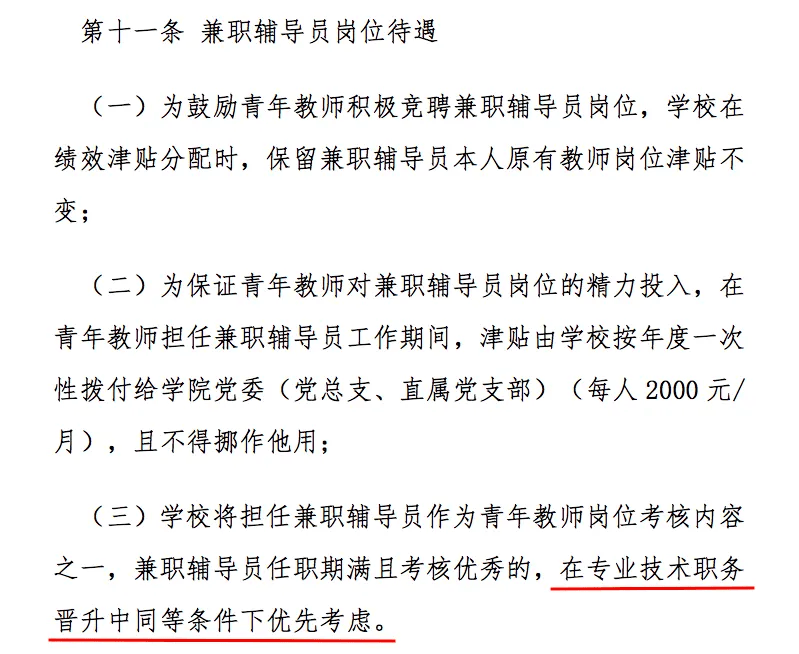 而在最為壓迫青椒的輔導員工作量上,其實《普通高等學校輔導員隊伍建設規(guī)定》中,已經明確“兼職輔導員工作量按專職輔導員工作量的三分之一核定”。合肥工業(yè)大學還在此基礎上增發(fā)每月1000元的績效津貼,并且經考核稱職的,當年免科研/教研工作量,教學工作量減免50%。