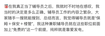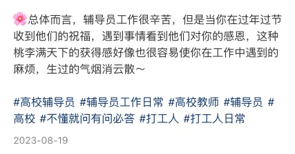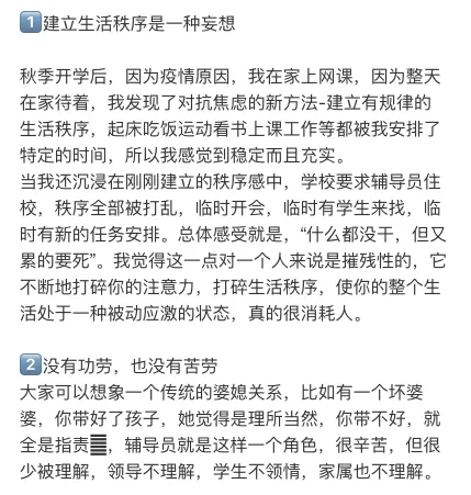 有人感慨建立生活秩序是一種妄想,好像“什么都沒干,但又累的要死”,像傳統(tǒng)婆媳關系中受盡委屈的兒媳,沒有功勞,也沒有苦勞;也有人自嘲輔導員就是“保姆+保安+樓管”,而兼職輔導員還要加上“免費的”前提。