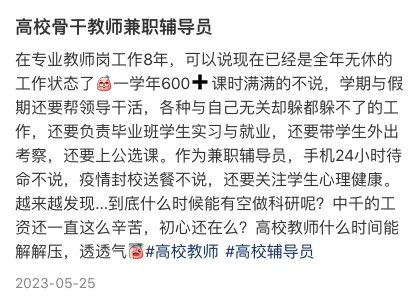對于新入職的青椒,這種壓力更是呈幾何級增加。還沒完全適應學生身份到教師身份的轉換,青椒就要被趕鴨子上架,擔任輔導員這樣一個需要思想政治、心理健康等多方面綜合能力的專業(yè)崗位。