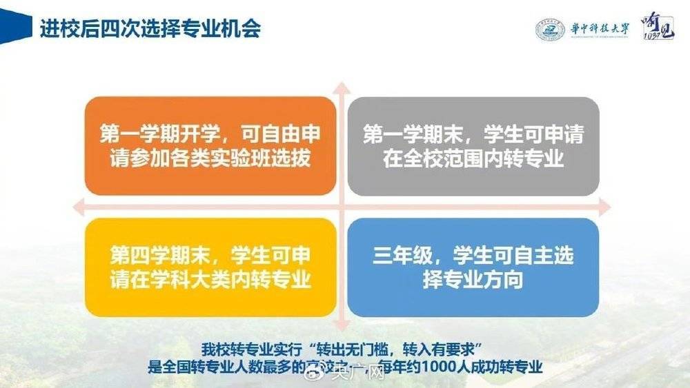 作為全國轉專業人數最多的高校之一,華中科技大學每年都有約1000人成功轉專業。以2023年的招生介紹來說,該校在學生入校后有四次選擇專業的機會:第一學期開學,學生可以自由申請參加各類實驗班選拔;第一學期末,學生可申請在全校范圍內轉專業;第四學期末,學生可申請在學科大類內轉專業;到了大三年級,學生可第四次自主選擇專業方向。此外,2023年5月,吉林大學宣布放開轉專業限制,每人有12次重新選擇專業的機會。中國科學技術大學也已實行“零門檻100%自由轉換專業”政策。