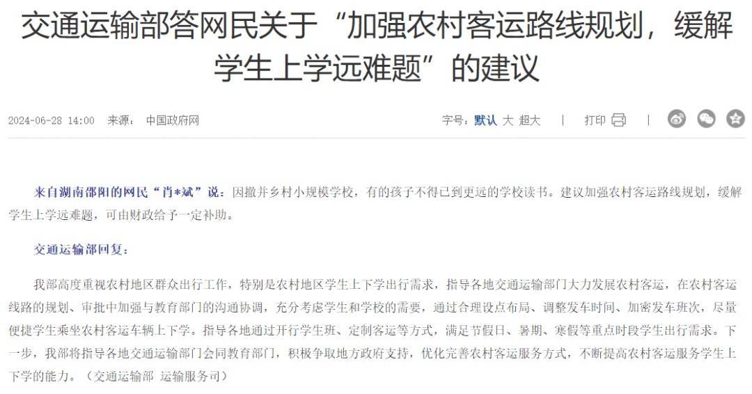 據(jù)中國政府網(wǎng)6月28日消息,有來自湖南邵陽的網(wǎng)民近日留言建議稱,因撤并鄉(xiāng)村小規(guī)模學(xué)校,有的孩子不得已到更遠(yuǎn)的學(xué)校讀書,建議加強(qiáng)農(nóng)村客運(yùn)路線規(guī)劃,緩解學(xué)生上學(xué)遠(yuǎn)難題,可由財(cái)政給予一定補(bǔ)助。