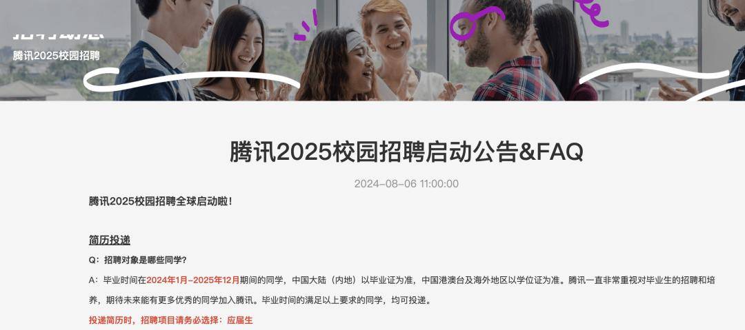 騰訊2025校園招聘對象的畢業時間放寬至2024年1月-2025年12月,中國大陸(內地)以畢業證為準,中國港澳臺及海外地區以學位證為準。