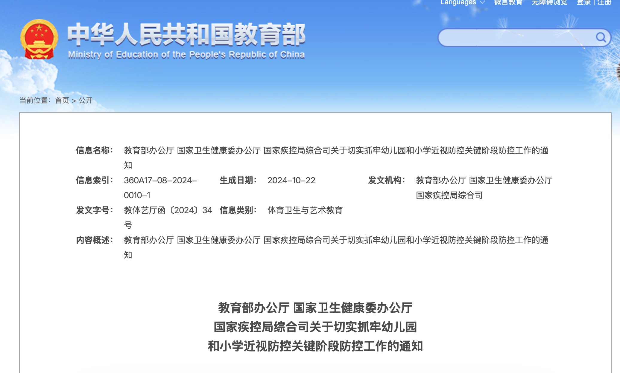 近日,教育部聯合國家衛生健康委、國家疾控局印發《關于切實抓牢幼兒園和小學近視防控關鍵階段防控工作的通知》(以下簡稱《通知》),要求前移防控關口,抓牢幼兒園和小學近視防控關鍵階段防控工作,有效減少幼兒和小學生近視發生。
