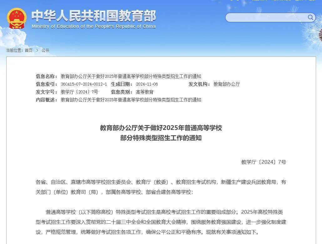 摘要: 原標題:事關2025高考!教育部印發重要通知 普通高等學校特殊類型招生是高校考試招生工作的重要組成部分。日前,教育部印發通知,對做好2025年普通高