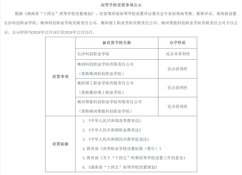 擬新設置長沙科技職業學院、株洲科技職業學院有限責任公司(簡稱株洲科技職業學院)、衡陽理工職業學院有限責任公司(簡稱衡陽理工職業學院)、郴州智能科技職業學院有限責任公司(簡稱郴州智能科技職業學院)等4所高校。