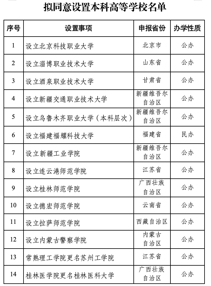 根據《中華人民共和國高等教育法》《普通高等學校設置暫行條例》《普通本科學校設置暫行規定》《本科層次職業學校設置標準(試行)》等有關規定以及第八屆全國高等學校設置評議委員會考察評議結果,經教育部黨組會議審議,擬同意設置北京科技職業大學、福建福耀科技大學等14所學校,現予公示。公示時間為2025年1月13日至1月17日。