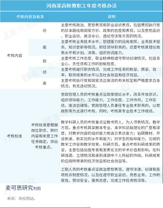 以河南某高校為例,該??己说膬?nèi)容主要是德、能、勤、績(jī)、廉等五方面,重點(diǎn)是工作實(shí)績(jī),考核實(shí)績(jī)以崗位職責(zé)(崗位說(shuō)明書(shū))以及職工收入分配辦法中不同崗位年度的教學(xué)、教科研基本工作量為依據(jù)。