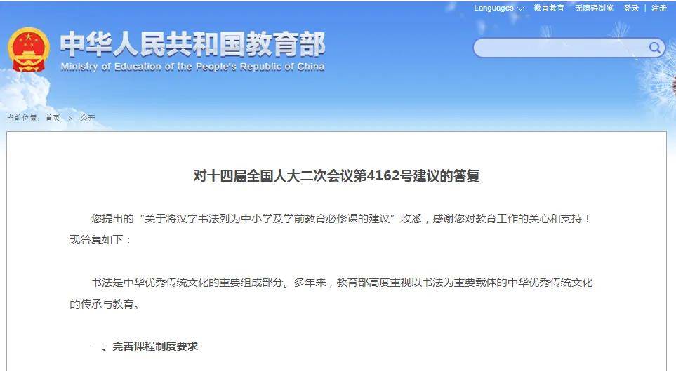 教育部在答復(fù)中表示,我國高度重視以書法為重要載體的中華優(yōu)秀傳統(tǒng)文化的傳承與教育,并詳細闡述了當前中小學(xué)、幼兒園的書法教育現(xiàn)狀。