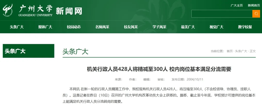 早在20多年前,廣州大學便開啟了新一輪的行政人員精簡工作,將現有的428名機關行政人員,壓縮至300人(不含校領導、協理員、掛職人員)。山東大學則于2015年基本完成“三定”工作(定工作職責、內設機構和人員編制及領導職數)。改革后,學校事業編制人員減少15.2%,處級崗位減少9.3%,達到了精兵簡政的效果。