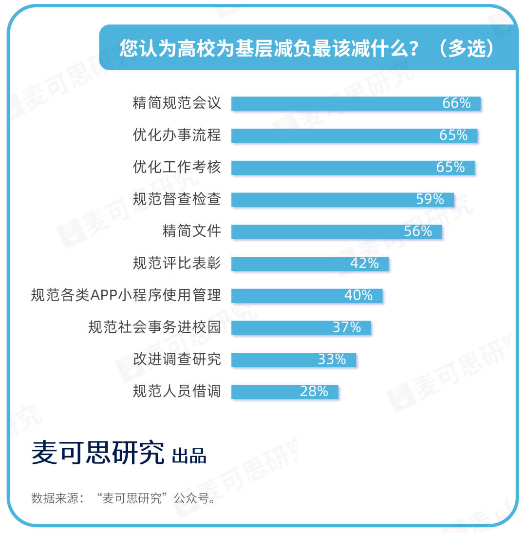 高校要為基層減負(fù),教師們最希望減什么?此前,麥可思研究曾發(fā)起相關(guān)投票。最終,精簡規(guī)范會(huì)議、優(yōu)化辦事流程、優(yōu)化工作考核、規(guī)范督查檢查、精簡文件等5個(gè)方面依次獲得票數(shù)最多,得票率均超過50%。