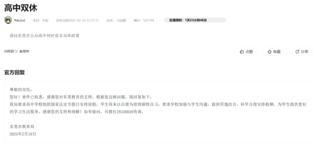 近日,在東莞市陽光熱線問政平臺,有網友咨詢高中雙休何時落地,東莞市教育局回復:我局要求高中學校按照國家法定節假日安排放假,學生周末以自愿為原則留校自習。
