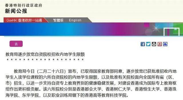 據(jù)香港特區(qū)政府消息,香港特區(qū)政府教育局2月26日宣布,已取得國(guó)家教育部同意,逐步放寬6所自資院校的內(nèi)地學(xué)生限額,并批準(zhǔn)有關(guān)院校面向全國(guó)所有省(區(qū)、市)招生。