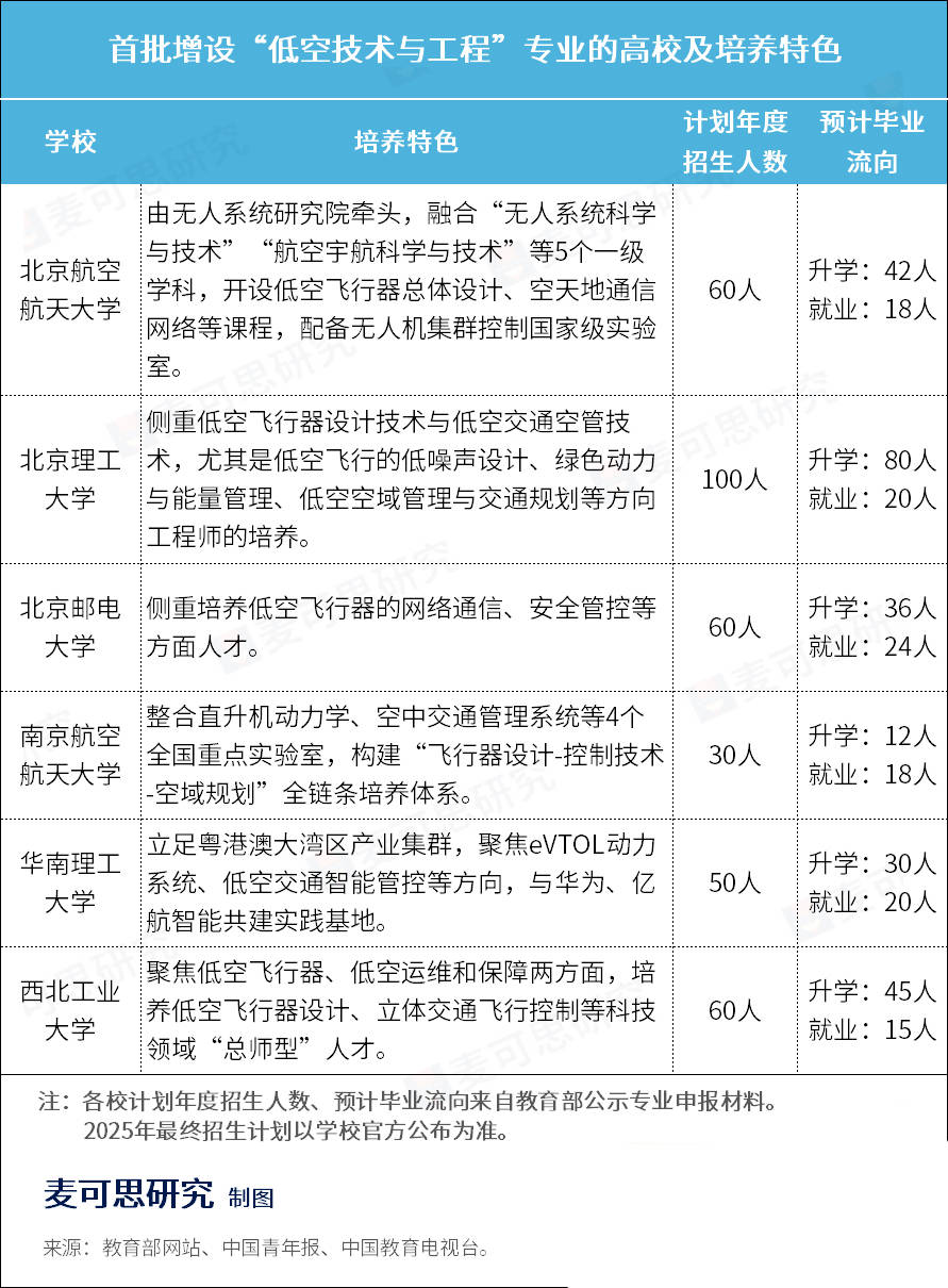 為更快響應國家戰略,教育部首次建立了戰略急需專業超常設置機制,突破集中申報限制,指導北京航空航天大學等6所高校增設“低空技術與工程”新專業。并且從各校的專業人才培養方向來看,不同院校各具特色。