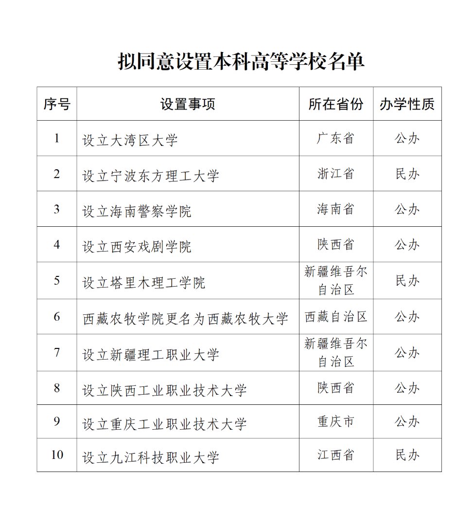 據教育部網站消息,教育部發展規劃司6月11日發布《關于擬同意設置本科高等學校的公示》。根據《中華人民共和國高等教育法》《普通高等學校設置暫行條例》《普通本科學校設置暫行規定》《本科層次職業學校設置標準(試行)》等有關規定以及第八屆全國高等學校設置評議委員會考察評議結果,經教育部黨組會議審議,擬同意設置大灣區大學等10所學校。