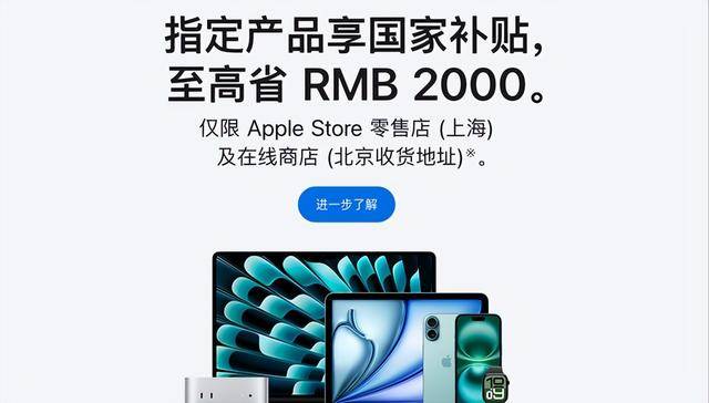 活動頁面顯示,指定產(chǎn)品享國家補貼至高省2000元。其中,符合資格的消費者購買參與活動的iPhone、iPad、Apple   Watch時,可享商品到手價基礎(chǔ)上再立減15%的國家補貼,每件補貼不超過500元,僅限到手價不超過6000元的單件商品;購買參與活動的Mac時,可享商品到手價基礎(chǔ)上再立減20%的國家補貼,每件補貼不超過2000元。