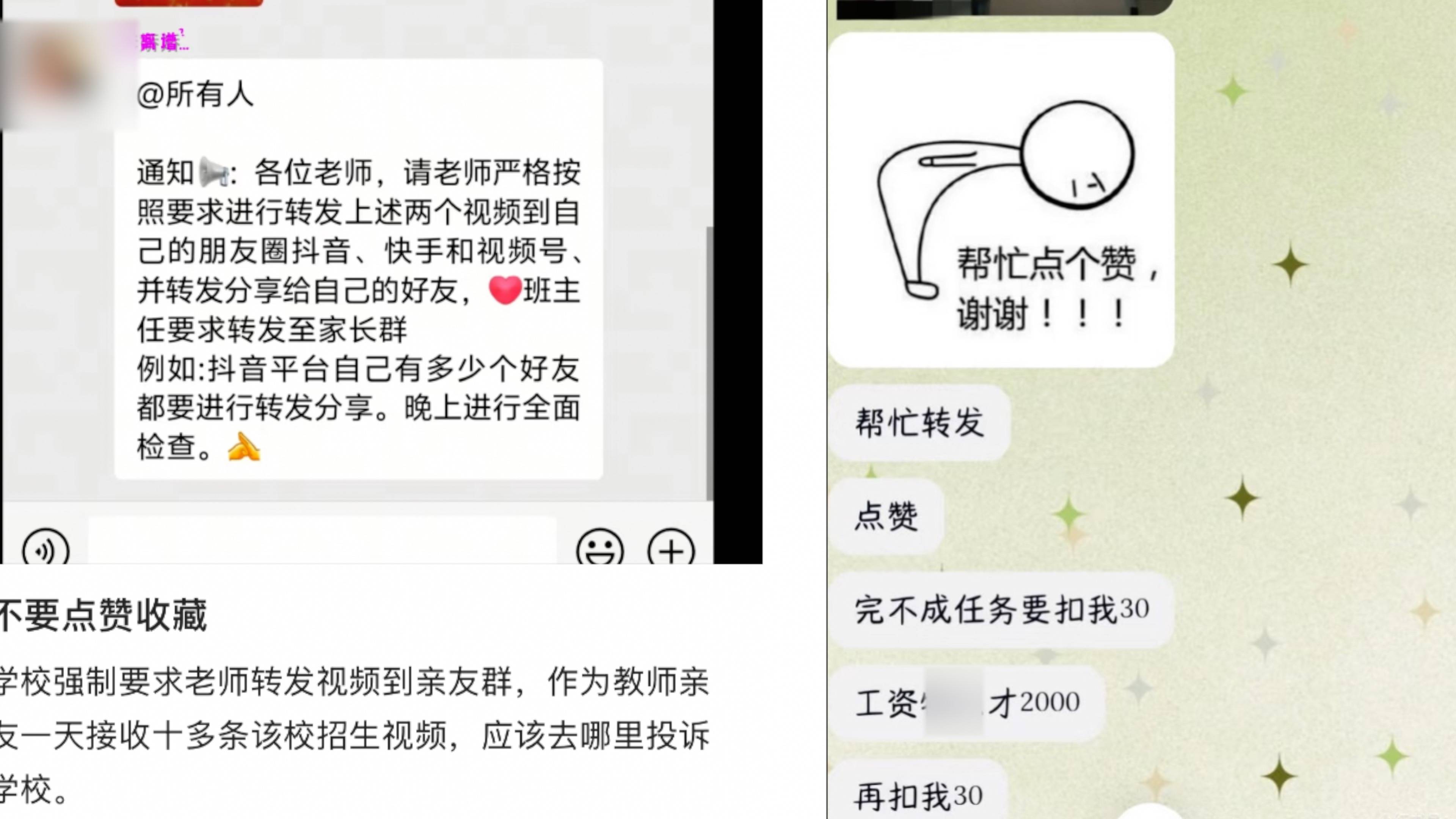 近日,有網友反映,山東濟寧金鄉縣青華園外國語學校強制要求老師轉發視頻,稱自己作為老師的朋友一天接受十多條招生視頻。這名網友貼出教師工作群的通知,要求老師轉發視頻到自己的朋友圈以及其他社交平臺賬號,還要分享給好友,并稱社交平臺有多少個好友都有轉發,晚上要全面檢查。網友還曝光了這家學校的《教師宣傳工作檢查細則(示例)》,明確了要檢查教師關注賬號、點贊互動、留言還有朋友圈、微信群宣傳情況,需要截圖證明。此外,網友還發布了與朋友的聊天記錄,朋友稱完不成任務要被罰款30塊。