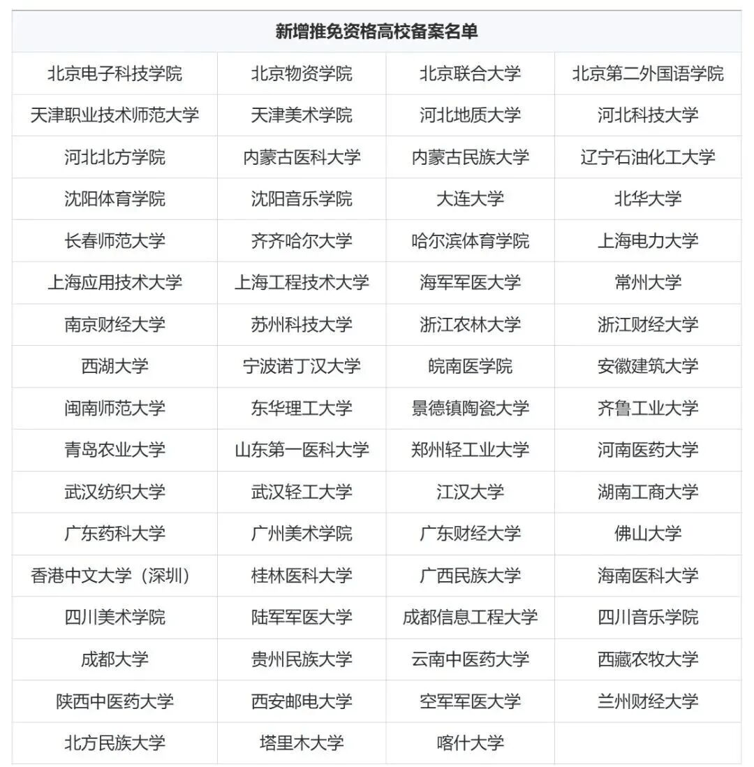 新增推免資格高校備案名單: