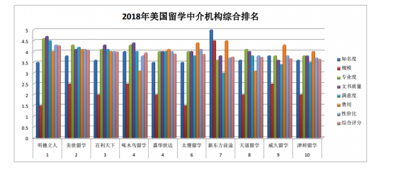 在本次調研中,被調查對象從老師專業度,文書質量,結果滿意度等7項指標對申請美國留學中介機構進行了評價。調查結果顯示,國內申請美國留學中介機構綜合排名TOP3的機構分別為明德立人,美世留學和百利天下。