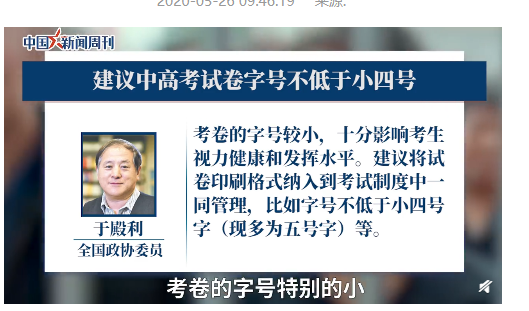 全國(guó)政協(xié)委員、商務(wù)印書館總經(jīng)理于殿利在接受記者采訪時(shí)表示,我國(guó)中高考試卷一直存在印制格式不規(guī)范問題,尤其是考卷的字號(hào)特別得小,十分影響考生視力健康和發(fā)揮水平。他建議將試卷印刷格式納入到考試制度中一同管理,比如字號(hào)不低于小四號(hào)字(現(xiàn)多為五號(hào)字)、行間距不低于1.5倍(現(xiàn)多為單倍)等。“可能一個(gè)考卷會(huì)多用幾張紙,增加一些成本,可與孩子們的健康相比,多耗這幾張紙,我覺得應(yīng)該是值得的。”
