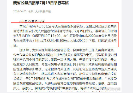2020年山東省公務(wù)員考試 于7月19日舉行筆試!準考證打印時間為7月13日9∶00至7月19日15∶00>