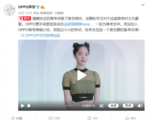 6月22日,OPPO聲學官方微博發布了一條高考降噪倡議視頻,同時宣布開啟OPPO高考降噪計劃,為考生降噪,為2020高考加油。視頻中歐陽娜娜倡議“給考生充分的空間,保持安靜就是對他們最好的鼓勵,7月,一起為高考降噪”,同時通過雙擊OPPO Enco W51打開降噪功能這一動作,號召大眾一起為考生降噪。