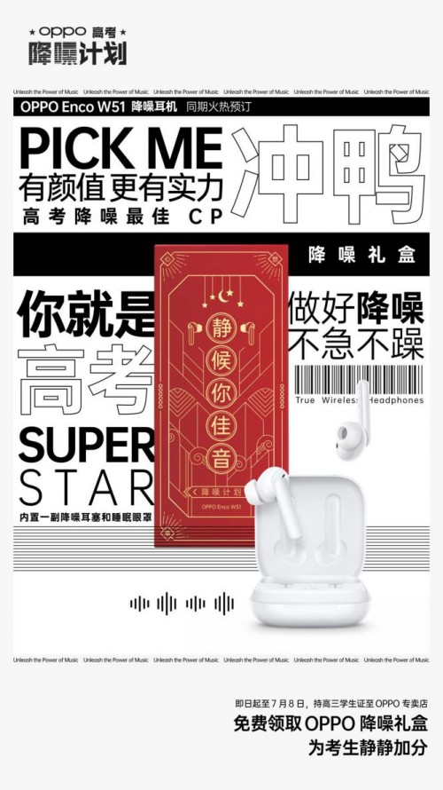 高考在即,各大品牌或明星都在以不同的方式為考生送上祝福,而此次OPPO聲學攜手歐陽娜娜發起的OPPO高考降噪計劃,不僅展現了一個明星該有的正能量和號召力,更體現了一個企業的社會責任感。2020年,讓我們和OPPO Enco W51降噪耳機一起為高考降噪,為考生加油。