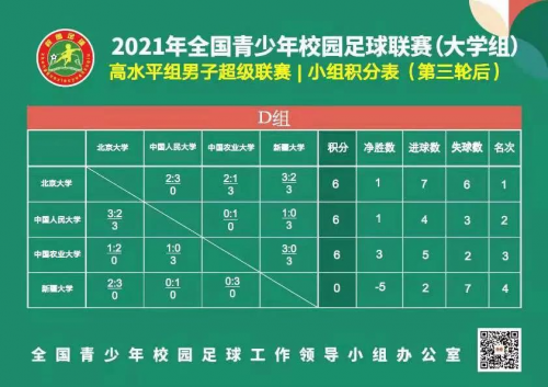 D組北京大學(xué)、中國(guó)人民大學(xué)、中國(guó)農(nóng)業(yè)大學(xué)在小組賽最后一戰(zhàn)之前,均有出線的可能性。在最后一輪的比賽中,北京大學(xué)和中國(guó)人民大學(xué)發(fā)揮更加優(yōu)秀,兩隊(duì)同積6分?jǐn)y手出線。
