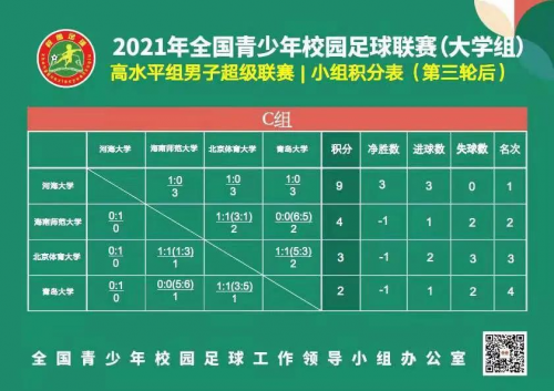 C組河海大學(xué)三戰(zhàn)全勝,未失一球,拿滿9分,小組第一出線;海南師范大學(xué)則以兩場(chǎng)點(diǎn)球大戰(zhàn)的勝利拿到4分,以小組第二的成績(jī)擠入前八。