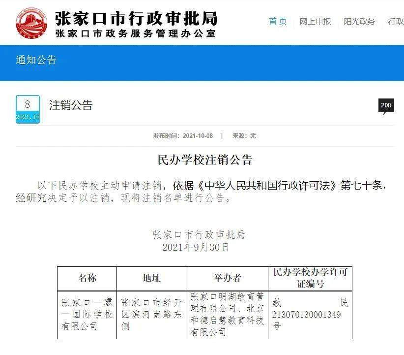 10月8日,張家口市行政審批局發(fā)布《民辦學(xué)校注銷(xiāo)公告》。公告稱,以下民辦學(xué)校主動(dòng)申請(qǐng)注銷(xiāo),依據(jù)《中華人民共和國(guó)行政許可法》第七十條,經(jīng)研究決定予以注銷(xiāo),現(xiàn)將注銷(xiāo)名單進(jìn)行公告。