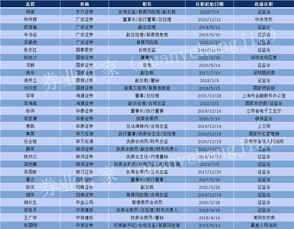 數年來定期整理券商人事變動的行家,早就發現,券商高管的主要來源之一,就是監管部門人員“下凡”。