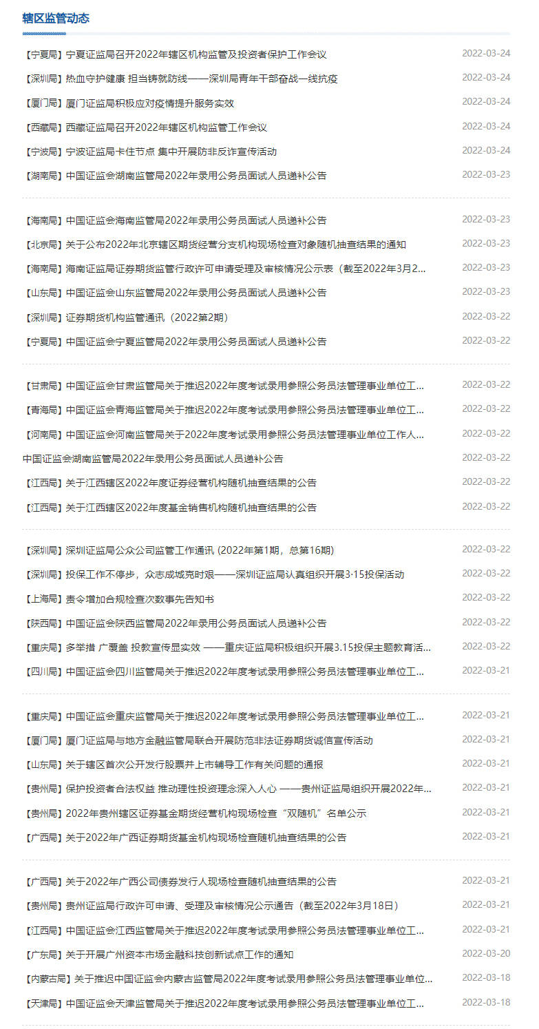 受疫情影響,包括證監會機關,北京、上海、廣東、深圳、江蘇、浙江、吉林、遼寧、福建、廈門、安徽、寧波、青島、河北、西藏證監局及滬、深專員辦共18家單位推遲了面試安排。其余20地證監局,將在今年3月26日(周六)進行面試。