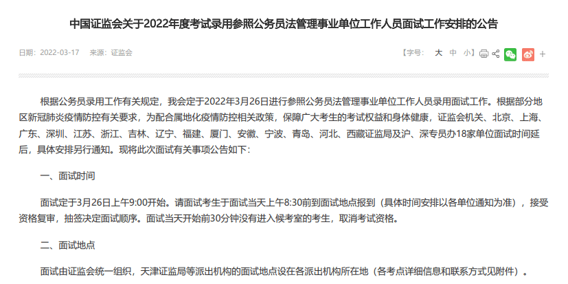 日前,證監會公告了《2022年度考試錄用參照公務員法管理事業單位工作人員面試工作安排》。