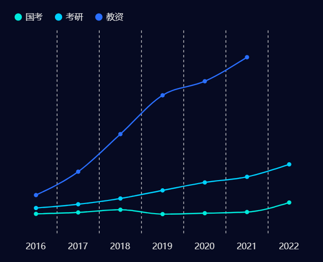 若以十年為一期來看,國考報名人數較2011年增長了約50% ,考研報名人數較2011年增長了約150%,教資報名人數較2011年增長了6652%。