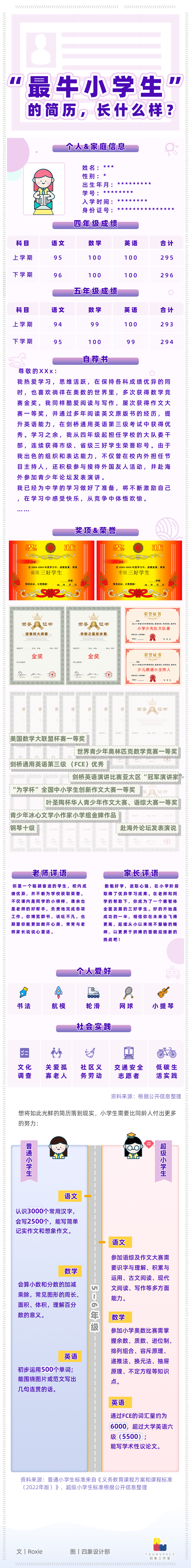 在“雞娃”教育盛行的時代,不少小學生身上背著種種標簽:超牛娃、牛娃、普娃、渣娃……其中超牛娃的簡歷自然不能太過簡單,動輒十幾頁厚不說,內容更遠不止于課堂成績。