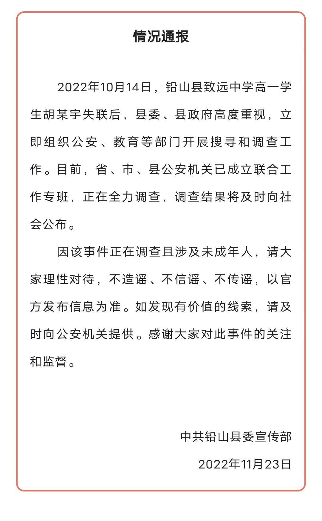 摘要: 原標題:江西一高中生失聯超1個月 當地通報:正全力調查,結果及時公布 11月23日,江西鉛山縣委宣傳部就高一學生胡某宇失聯一事發布情況通報。通報稱